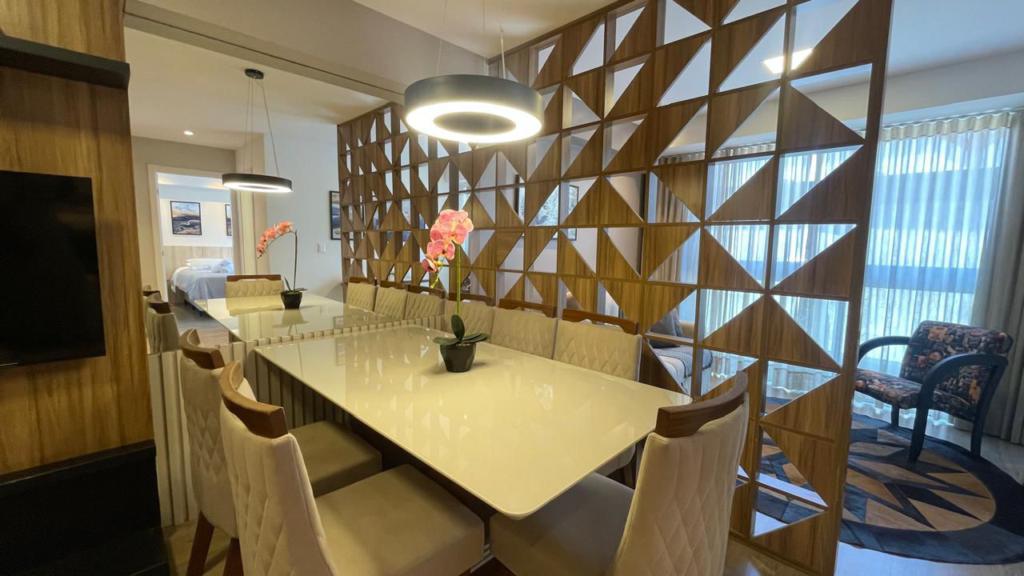 Conta com 02 suítes, salas de estar, jantar e cozinha integradas, churrasqueira, splits instalados, lavabo e garagem.